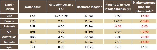 Zentralbanken agierten zuletzt vorsichtig: In Grossbritannien und Australien senkten sie die Leitzinsen im August wie erwartet um jeweils 0.25%. Für die nächste Sitzung der US-Fed im September preist der Markt mit einer Wahrscheinlichkeit von 89% eine Zinssenkung um 0.25% ein. Bei den übrigen grossen Notenbanken zeichnet sich kurzfristig jedoch kein weiterer Zinsschritt ab.