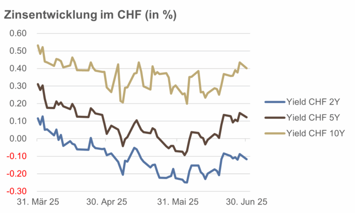 In der Eurozone gaben die Renditen leicht nach. Zehnjährige Bundesanleihen rentierten zum Quartalsende mit 2.60% (Ende März: 2.73%), italienische Papiere mit 3.50%. Bemerkenswert war die enge Renditekonvergenz verschiedener Euro-Länder: Spanien (3.25%), Griechenland (3.28%), Frankreich (3.29%). Die EZB senkte den Leitzins in zwei Schritten um insgesamt 50 Basispunkte auf 2.15%. Ein weiterer Schritt an den nächsten Sitzungen vom 24. Juli und 11. September wird vorerst nicht erwartet.
