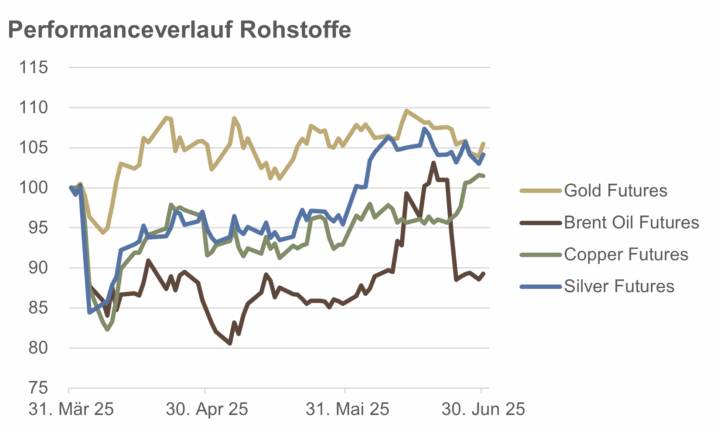 Der Goldpreis setzte seinen Aufwärtstrend fort und gewann im 2. Quartal 5.5%, womit sich das Plus seit Jahresbeginn auf beachtliche 25.9% summierte. Mitte Juni wurde mit $3‘450 je Feinunze ein neues Allzeithoch erreicht. Auch Silber legte zu und reduzierte gegen Quartalsende seinen Rückstand zum gelben Metall: ein Quartalsplus von 4.2% ergab ein Jahresplus von 23.3%.