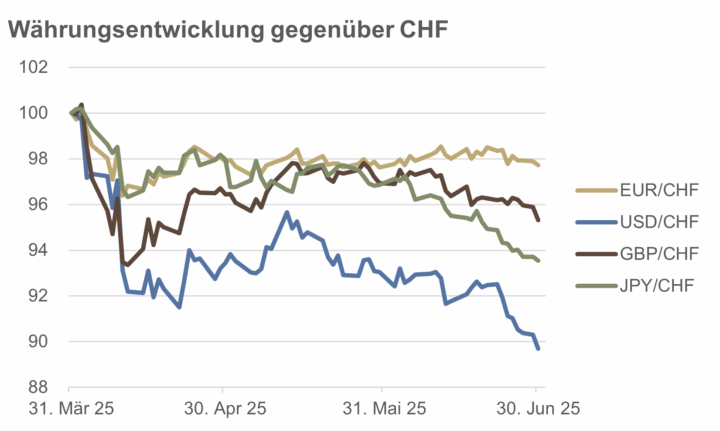 Besonders stark zeigte sich der Schweizer Franken. Gegenüber dem USD wertete er seit Ende März um 10.3% auf, seit Jahresbeginn um 12.6%. Das Währungspaar USD/CHF notierte Ende Juni bei 0.793 – ein Stand, der zuletzt 2011 erreicht wurde (abgesehen vom kurzen Ausschlag nach der SNB-Aufhebung des Mindestkurses zum Euro von 1.20 im Januar 2015).