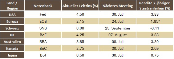 Die Renditen 2-jähriger Staatsanleihen geben wichtige Hinweise auf die Markterwartungen bezüglich der künftigen geldpolitischen Ausrichtung der Notenbanken (siehe Tabelle).