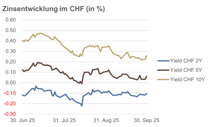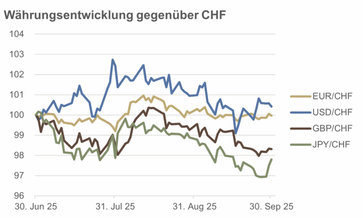 Gegenüber dem Franken zeigte sich der Euro weitgehend stabil. EUR/CHF pendelte im Quartalsverlauf zwischen 0.927 und 0.944 und schloss Ende September bei 0.935 – nahezu unverändert zum Vorquartal. Deutlicher bewegte sich der USD/CHF: der Dollar gewann im Quartal 0.4%, lag seit Jahresbeginn aber weiterhin über 12% im Minus. Ende September stand das Währungspaar bei 0.796 (Ende Juni: 0.793).