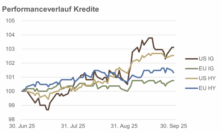 Die Rendite zehnjähriger US-Staatsanleihen sank im 3. Quartal leicht auf 4.15%, nach 4.23% Ende Juni. Die Schwankungsbreite verringerte sich deutlich auf einen Bereich zwischen 4.0% und 4.5%. Dieser moderate Rückgang führte zu einem leichten Preisanstieg des iShares 20+ Year Treasury Bond ETF (TLT) um 1.3%. Noch etwas stärker gaben die Renditen zweijähriger US-Anleihen nach, die zum Quartalsende bei 3.60% lagen (Vorquartal: 3.73%). Damit kam es zu einem sogenannten „bull steepener“: die Zinskurve zwischen zehn- und zweijährigen Papieren weitete sich auf 55 Basispunkt aus. Am 17. September senkte die US-Notenbank den Leitzins wie erwartet von 4.50% auf 4.25%. Für die verbleibenden Sitzungen am 29. Oktober und 10. Dezember rechnen Marktteilnehmer mit zwei weiteren schrittweisen Senkungen.