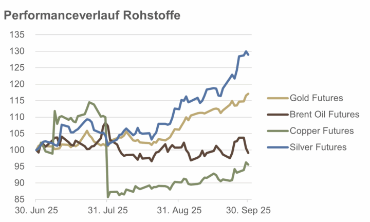 Die Edelmetalle Gold und Silber verzeichneten im 3. Quartal kräftige Kursgewinne. Der Goldpreis stieg um 17%, jener von Silber gar um 29%. Seit Jahresbeginn ergab sich damit ein Plus von 47% für Gold beziehungsweise 60% für Silber, jeweils in USD. Getrieben wurde die Rally von anhaltenden Zentralbankkäufen, tendenziell sinkenden US-Zinsen, einem schwächeren Dollar sowie geopolitischen Spannungen. Einige Studien versuchten zudem mittels Regressionsanalysen nachzuweisen, dass steigende Preise Anlegerzuflüsse in Edelmetallfonds auslösten – und nicht umgekehrt.