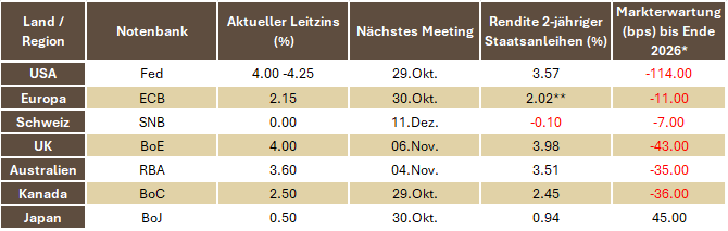 Im Vereinigten Königreich stiegen die Renditen zehnjähriger Gilts zum Quartalsende auf 4.70%, nach 4.44% Ende Juni. Die Bank of England senkte ihren Leitzins im Quartalsverlauf auf 4.00%, signalisierte aber vorerst eine Pause. Eine weitere Senkung an der Sitzung vom 6. November wird von den Märkten nicht eingepreist.