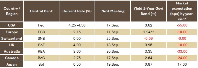 Central banks have moved cautiously. The Bank of England and the Reserve Bank of Australia both cut rates by 25 basis points in August, in line with expectations. Markets now assign an 89% probability to a quarter-point cut at the Federal Reserve’s September meeting. Among other major central banks, no immediate policy moves are in sight.