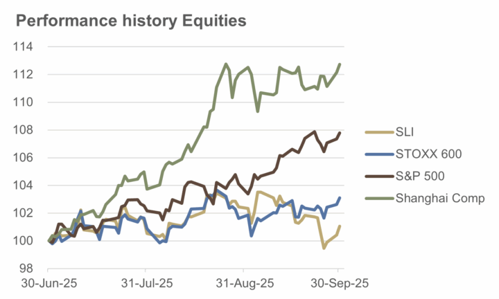 Year-to-date (as of 3 October), the S&P 500 was up 14.2% and the Nasdaq Composite 17.3%. In Europe, the STOXX 600 gained 10.0% and the SLI 3.2%. In Asia, the Shanghai Composite rose 15.8%, the Hang Seng surged 33.9%, and the Nikkei 225 added 12.6%.