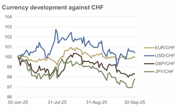 Against the Swiss franc, the euro remained largely stable. EUR/CHF fluctuated between 0.927 and 0.944 during the quarter, closing at 0.935 at the end of September – almost unchanged from the previous quarter. The US dollar moved more noticeably versus the franc, gaining 0.4% over the quarter, though it remained over 12% below its level at the start of the year. USD/CHF stood at 0.796 at the end of September (end of June: 0.793).