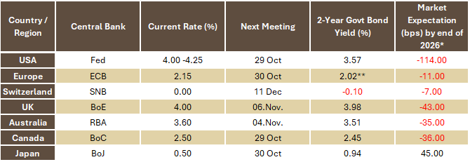 In the United Kingdom, ten-year gilt yields rose to 4.70% by the end of the quarter, up from 4.44% at the end of June. The Bank of England lowered its policy rate to 4.00% during the quarter but signaled a pause for now. Markets are not pricing in an additional cut at the next meeting on 6 November.