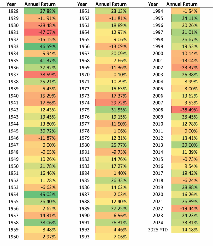 The table below shows the historical annual returns of the S&P 500 equity index.